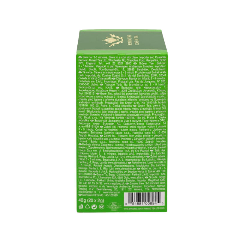 Discover the pure and refreshing taste of Ahmad Tea Green Tea, a Classic Blend crafted from the finest Chinese green teas. Known for its delicate flavor and subtle floral notes, this tea offers a soothing experience. Each of the 20 tea bags is individually wrapped in foil to guarantee maximum freshness. Ethically sourced and rich in antioxidants, this green tea is perfect for daily enjoyment by discerning tea enthusiasts.