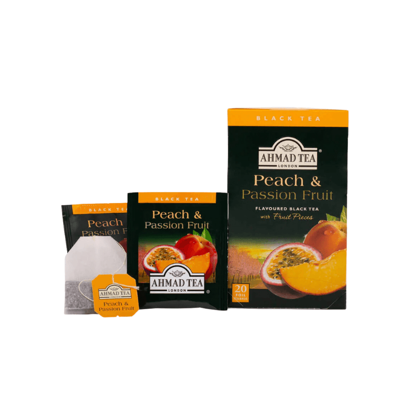 Ahmad Tea Peach & Passion Fruit Flavoured Black Tea with Fruit Pieces – 20 Foil-Wrapped Bags | Exotic & Refreshing Brew