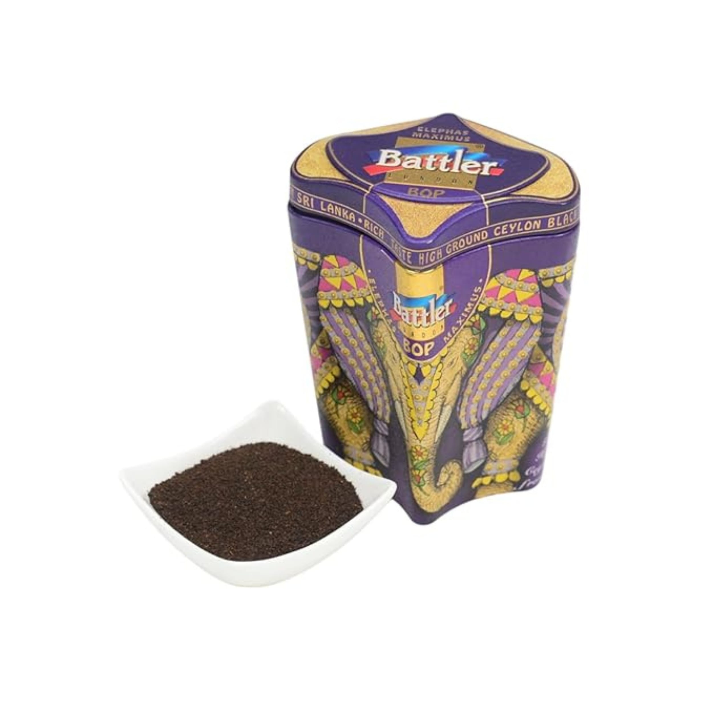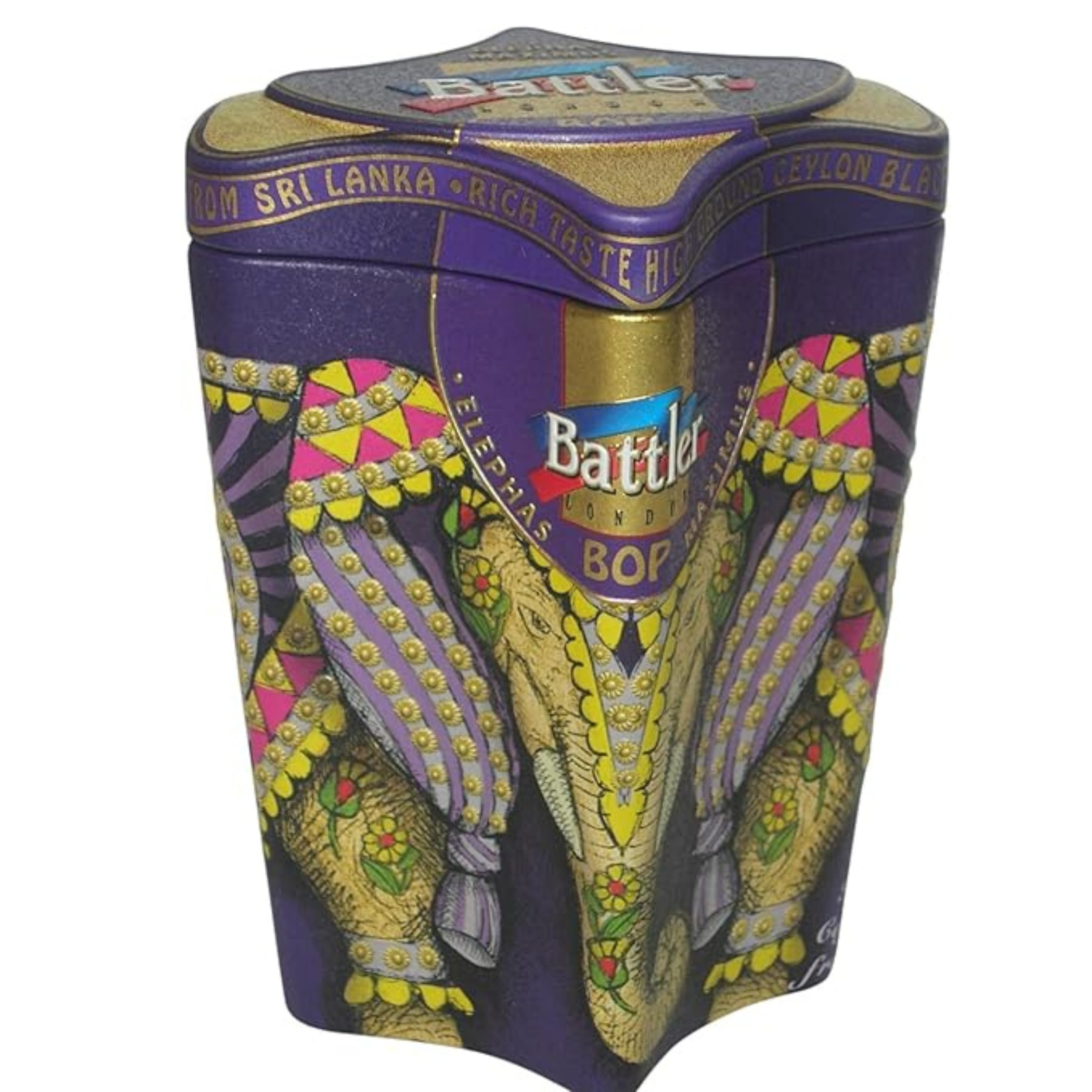 Discover the rich taste of Battler Elephas Maximus BOP Ceylon Black Tea, sourced from the high-grown regions of Sri Lanka. Presented in a distinctive tin featuring vibrant elephant artwork, this BOP (Broken Orange Pekoe) tea offers a robust flavor and captivating aroma, characteristic of authentic Ceylon tea. Perfect for gifting or personal enjoyment, it provides an invigorating and flavorful tea experience.
