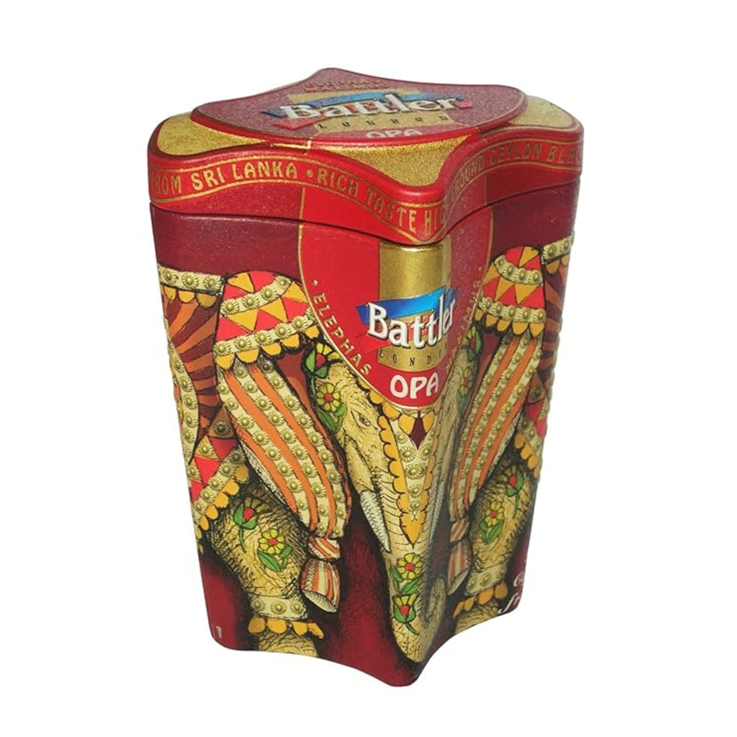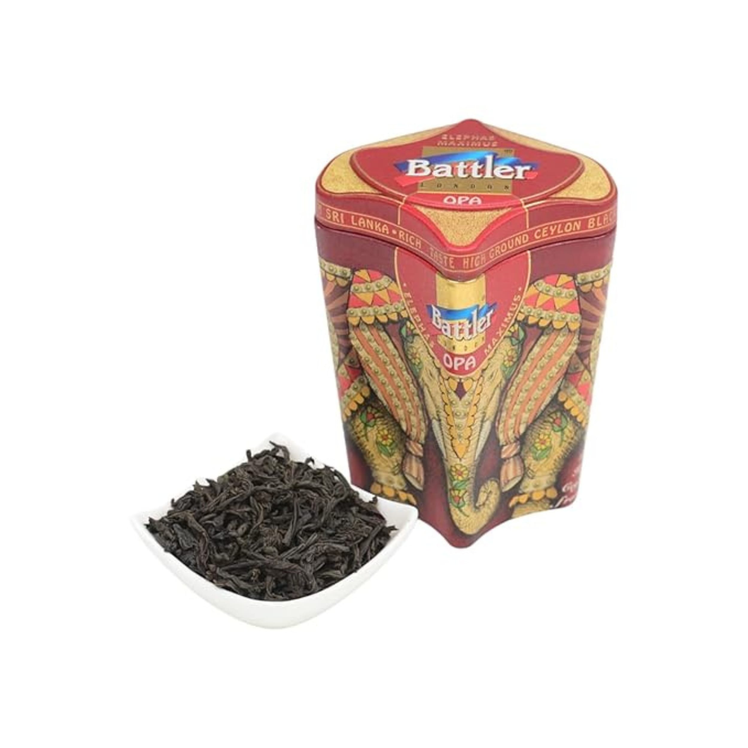 Battler Elephas Maximus OPA Ceylon Black Tea is the ultimate choice for discerning tea lovers seeking an authentic and invigorating Sri Lankan experience. Sourced from the renowned high-grown regions of Sri Lanka, this premium Ceylon black tea is celebrated for its rich flavor and captivating aroma. The distinctive OPA (Orange Pekoe A) leaf grade ensures a visually appealing long, wiry, and well-twisted leaf, promising a full-bodied and robust brew with every steep. Presented in a stunning, decorative tin featuring the majestic Elephas Maximus motif, this tea not only delights the palate but also serves as an exquisite piece of art, making it an ideal gift for tea connoisseurs and collectors alike. This whole leaf tea offers a refreshing and strong flavor profile that is characteristic of Sri Lanka’s finest tea traditions.
