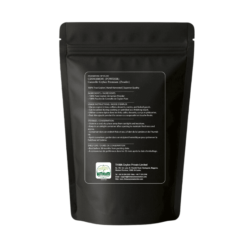 Discover the authentic essence of Sri Lanka with THIMA Ceylon Premium Cinnamon Powder. This exquisite 100g pack features 100% true Ceylon cinnamon, known for its delicate sweetness and warm spice. Hand-harvested and ethically sourced, it’s naturally gluten-free and non-GMO, with no artificial additives. Perfect for baking, beverages, and savory dishes, this premium spice also offers potential health benefits like anti-inflammatory properties. Elevate your culinary creations with the superior quality and pure flavor of THIMA Ceylon.