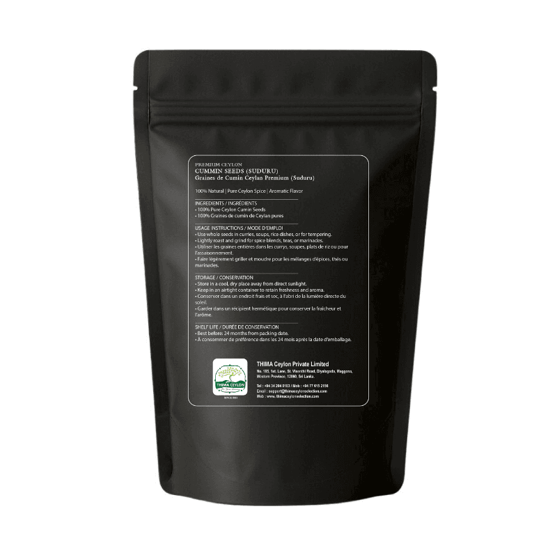 Discover the rich, aromatic flavor of THIMA Ceylon Premium Sun-Dried Cumin Seeds (Suduru). Sourced from Sri Lanka, these 100% natural cumin seeds are handpicked and sun-dried to perfection, ensuring a pure and intense nutty and slightly peppery taste. Ideal for enhancing curries, rice dishes, soups, and marinades, these premium quality seeds are gluten-free and non-GMO. Elevate your culinary creations with this authentic Sri Lankan spice.
