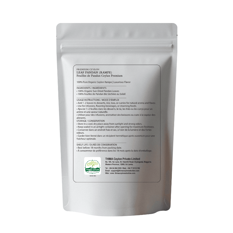 THIMA Ceylon Premium Sun-Dried Pandan Leaves (Rampe) is the ultimate solution for adding authentic Sri Lankan fragrance and flavor to your cooking because it is made from 100% pure organic Ceylon pandan leaves. It also features a potent natural aroma and is carefully sun-dried, making it the perfect choice for home cooks and culinary enthusiasts seeking Sri Lankan cuisine. Elevate your rice dishes, curries, and desserts with the unique, fragrant notes that only authentic Rampe can provide.