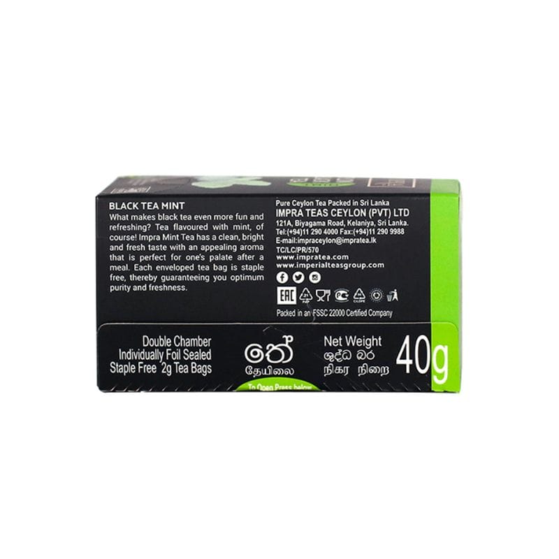 Experience the invigorating Impra Ceylon Mint Flavoured Black Tea. Each of the 20 staple-free, double-chamber tea bags is individually foil-sealed to ensure lasting freshness and a clean, bright taste. Infused with natural mint, this black tea offers a refreshing aroma and a delightful palate experience, making it the perfect choice for any time of day.