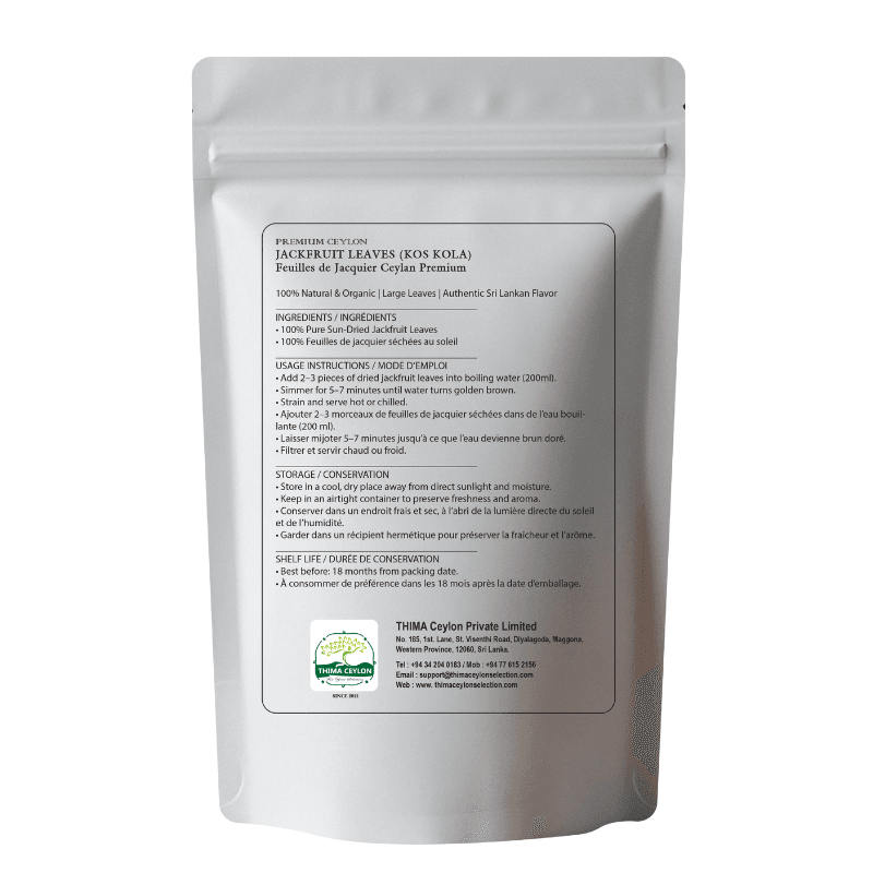 THIMA Ceylon Premium Sun-Dried Jackfruit Leaves Tea (Kos Kola) is the ultimate solution for those seeking authentic Sri Lankan flavors and natural wellness because it offers a rich aroma and distinctive taste. It also features a 100% natural, sun-dried preparation and versatility in culinary uses, making it the perfect choice for health-conscious individuals and culinary adventurers. Brew a soothing herbal tea or enhance the flavor of your favorite dishes with this premium ingredient.
