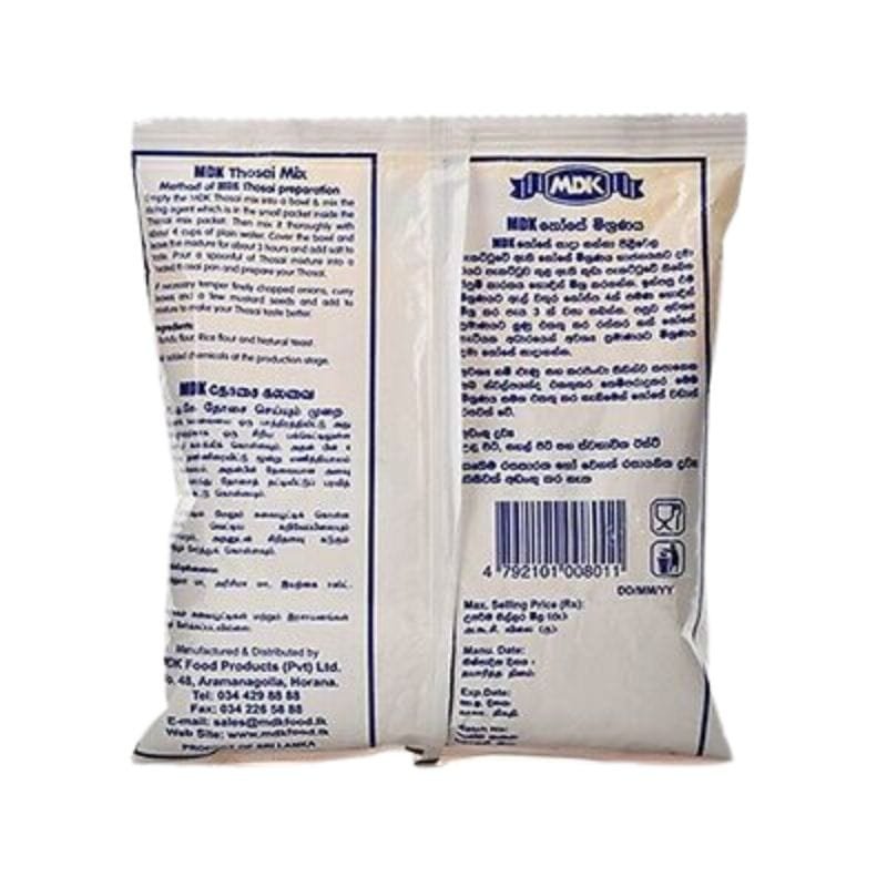 Experience the authentic taste of Sri Lanka with MDK Thosas Mix. This convenient 400g pack provides an instant batter for preparing delicious and crispy dosas, a popular South Asian delicacy. Made with high-quality rice flour and natural yeast, this mix ensures a perfect texture and flavor every time. Simply add water, let it ferment, and cook to enjoy a wholesome meal or snack. Ideal for busy households seeking a quick and authentic culinary experience.