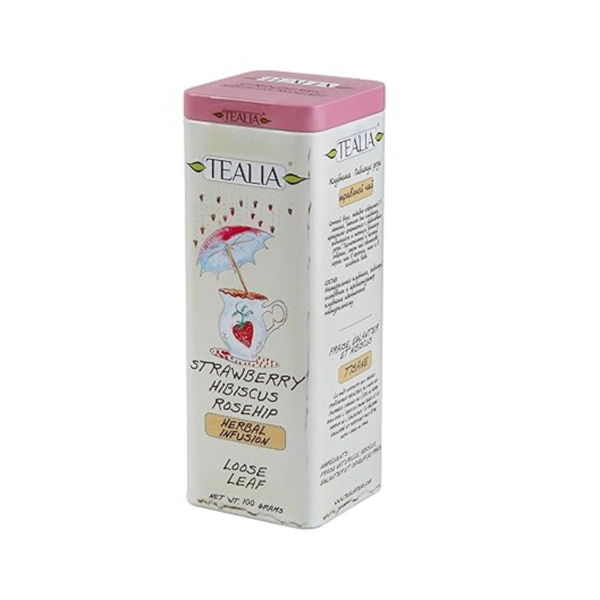 Tealia Strawberry Hibiscus Rosehip Loose Leaf Herbal Infusion is the ultimate choice for a delightful and health-conscious beverage experience, offering a perfect fusion of natural flavors and wellness benefits. This exquisite herbal infusion features a harmonious blend of sweet strawberry, tart hibiscus, and vitamin C-rich rosehip, creating a vibrant and refreshing taste profile that is completely caffeine-free. The loose leaf format ensures maximum flavor and aroma extraction, providing a superior tea experience with every cup. Packaged in an attractive tin, this 100g premium selection is ideal for personal enjoyment or as a thoughtful gift for tea enthusiasts.