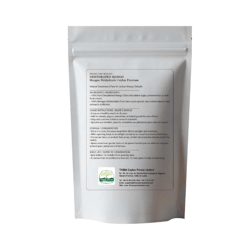 Indulge in the tropical sweetness of THIMA Ceylon’s Premium Dehydrated Mango. These 70g slices are crafted from the finest Sri Lankan mangoes, meticulously dehydrated to preserve their natural flavor and nutrients. Enjoy a healthy snack with no added sugars or artificial preservatives. Perfect for on-the-go enjoyment, enhancing breakfasts, or creative culinary uses, these slices offer a pure taste of nature.